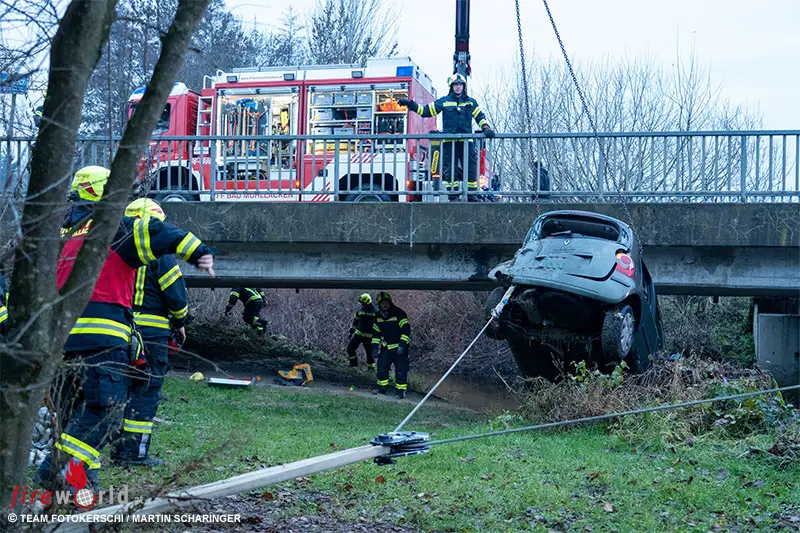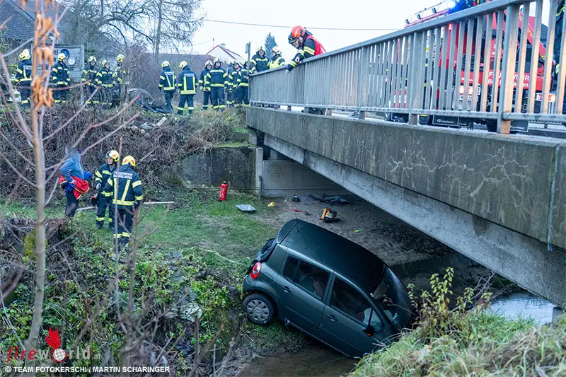 FELDKIRCHEN AN DER DONAU (OÖ): Am Nachmittag des 7. Dezember 2025 kam es gegen 15:26 Uhr auf der Aschacher Straße bei Feldkirchen an der Donau zu einem Verkehrsunfall. Ein Pkw kam aus bislang ungeklärten Gründen von der Fahrbahn ab, stürzte im Bereich der Pesenbach-Brücke eine Böschung hinunter und blieb mit der Frontpartie im Bachbett stehen.