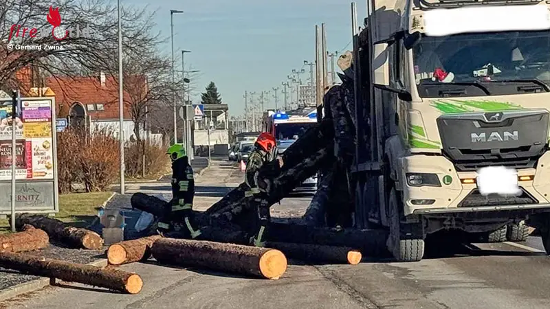 Nö: Holzlaster-Ladungsverlust nach Vollbremsung in Ternitz