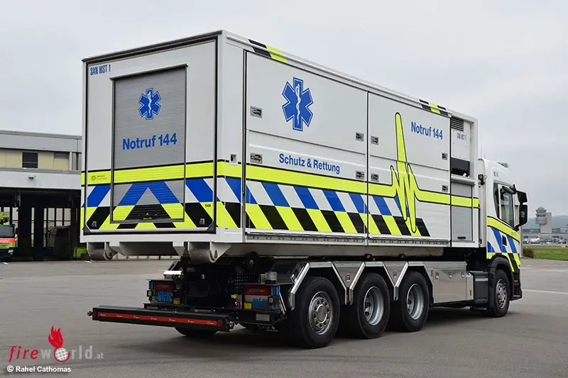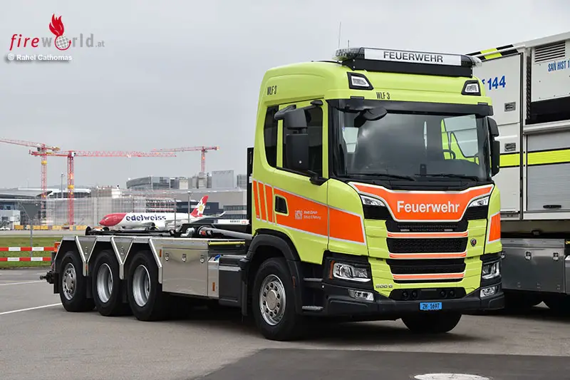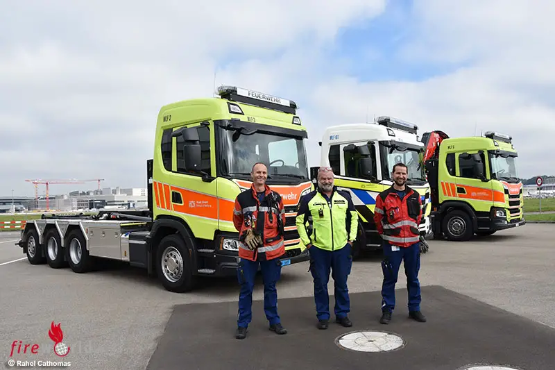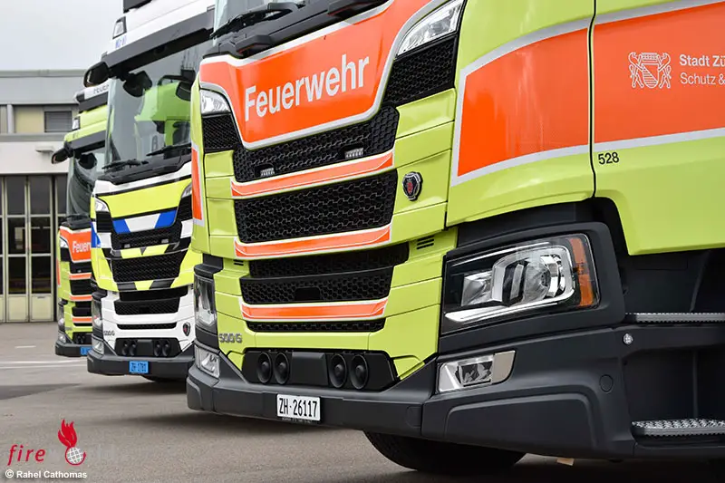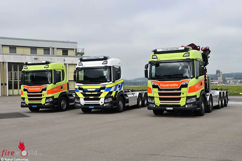 ZÜRICH (SCHWEIZ): Gleich drei neue Fahrzeuge des schwedischen Herstellers Scania durfte das Team von Schutz & Rettung Zürich (SRZ) entgegennehmen. Dies kommt nicht von ungefähr, denn mit den bereits vorhandenen Scania-Feuerwehrfahrzeugen ist man überaus zufrieden. Alle drei neuen Fahrzeuge erhielten ein Hakengerät Die beiden vierachsigen, mit Hakengerät versehenen Lastwagen sind vorwiegend in der Stadt Zürich unterwegs, während der Fünfachser auf dem Flughafen Zürich-Kloten stationiert ist.
