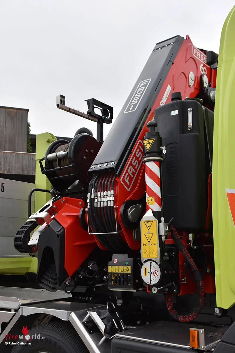 Dazu ist er mit den Sicherheits- und Assistenzsystemen der neusten Generation ausgerüstet. Für hohe Flexibilität im Einsatz sorgt der Aufbau aus dem Hause Notterkran: Ein hinter der Kabine montierter Fassi F545RA.2.26 xe-dynamic-Kran mit 16,3 m hydraulischer und zusätzlich 7,2 m manueller Reichweite und einer integrierten Seilwinde ermöglichen präzise und kraftvolle Kranarbeiten. Ergänzt wird das Fahrzeug durch ein Multilift Ultima 26Z.65 Flex Hakengerät mit einer Hub- und Kippkapazität von 26 t. Es können sämtliche Container der Feuerwehr transportiert werden, wie zum Beispiel das Flugzeug-Bergungsmaterial oder einen der drei Chemiewehr-Container der Gebäudeversicherung. Dazu wird der Fünfachser zur Bergung von Kleinflugzeugen eingesetzt.