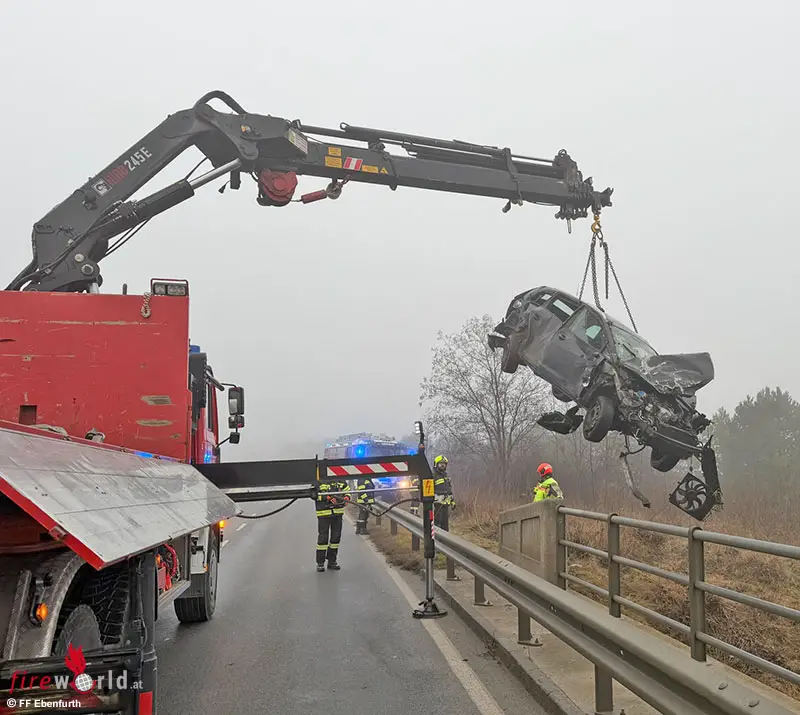 Gemeinsam mit dem Rettungsdienst und der Polizei wurden auch die Feuerwehren Haschendorf und Ebenfurth alarmiert. Mittels Kran der Feuerwehr Ebenfurth wurde der völlig zerstörte Pkw anschließend aus dem Uferbereich geborgen. Während der Bergearbeiten musste die L159 gesperrt werden.