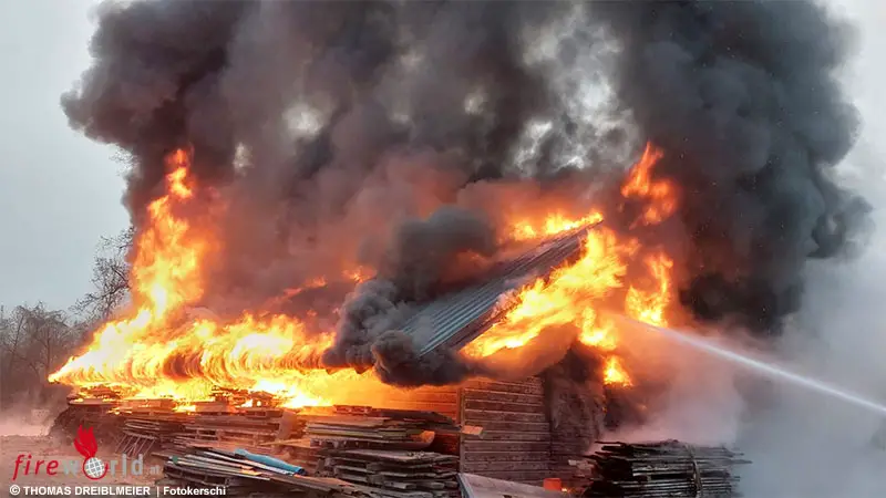 Oö: Holzlagerhalle in Kirchham lichterloh in Flammen → 8 Feuerwehren alarmiert