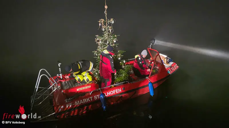 Nachdem Stadtpfarrer Mag. Trummler nach einem kurzen Gebet den Christbaum gesegnet hatte, wurde der Baum mit dem Jetboot der FF Stallhofen eine Runde über den See gefahren und im Anschluss von vier Tauchern der Tauchstaffeln Voitsberg, Graz-Umgebung und Deutschlandsberg im Pibersteinersee versenkt.