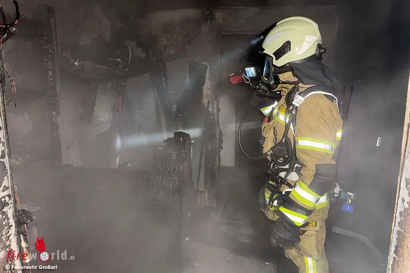 Parallel dazu wurden ein Außenangriff und ein Innenangriff gestartet. Der Brand konnte so rasch unter Kontrolle gebracht werden. Während der Löscharbeiten barsten jedoch Batterien und Lackdosen durch die Hitzeeinwirkung. Weiters wurden fünf Sauerstoffflaschen der nicht gehfähigen Person von den Atemschutztrupps aus dem brennenden Objekt geborgen.