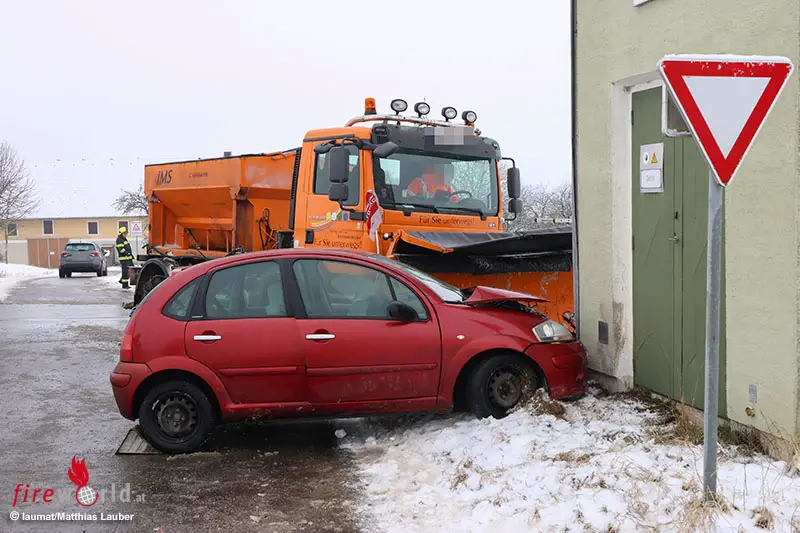 Oö: Schneepflug und Auto nach Kreuzungskollision in Kremsmünster gegen Trafostation gekracht