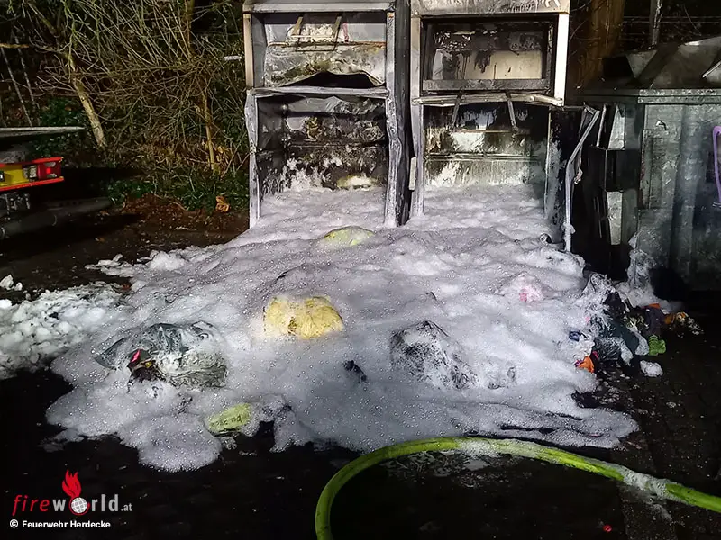 HERDECKE (DEUTSCHLAND): In der Nacht auf Samstag, 10. Jänner 2026, wurde die Feuerwehr Herdecke gegen 03:29 Uhr zu einem Brandereignis im Westender Weg alarmiert. Vor Ort brannten zwei Altkleidercontainer in voller Ausdehnung.