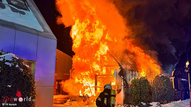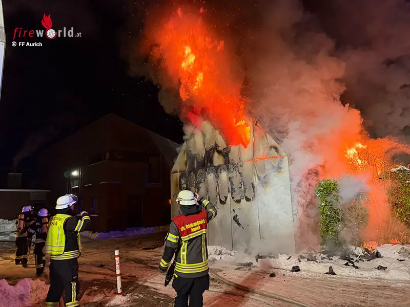 AURICH (DEUTSCHLAND): Aus einem anfänglichen Müllcontainerbrand hat sich in der Nacht zu Sonntag, 11. Jänner 2026, ein ausgedehntes Feuer am Fischteichweg entwickelt, dem ein Lagergebäude zum Opfer fiel und in Gänze zerstört worden ist.