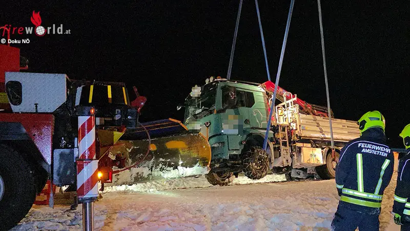 Zur Bergung des Fahrzeugs wurden die Feuerwehren Zarnsdorf und Amstetten alarmiert. Mithilfe des Autokrans der Feuerwehr Amstetten konnte das Schneeräumfahrzeug rasch und sicher geborgen werden.