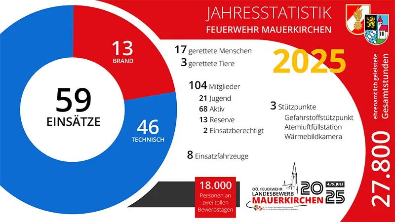 MAUERKIRCHEN (OÖ): Bei der 153. Vollversammlung der FF Mauerkirchen, die am Samstag, den 10. Jänner 2026, abgehalten wurde, blickten die Mitglieder auf das Jahr 2025 zurück. 17 Menschen und drei Tiere konnten in den in Summe 59 Einsätzen gerettet werden.