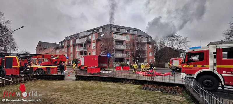 GREVENBROICH (DEUTSCHLAND): Bei einem Brand in der Tiefgarage zweier Mehrfamilienhäuser im Grevenbroicher Ortsteil Neuenhausen sind am Mittwochvormittag, 14. Januar 2026, zwei Fahrzeuge vollständig ausgebrannt, acht weitere wurden durch Rauch stark beschädigt. Eine Person musste nach dem Einatmen von Rauchgas zur Untersuchung ins Krankenhaus gebracht werden, drei weitere Bewohner wurden vor Ort medizinisch betreut.