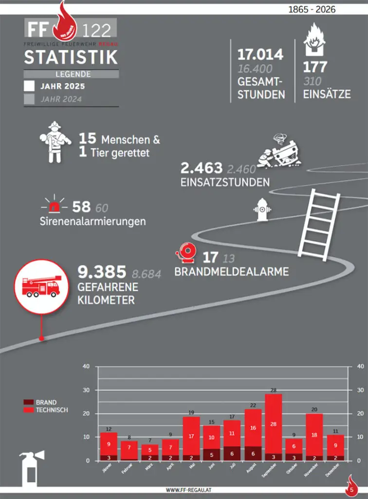 Die geringere Einsatzbelastung kam der Feuerwehr im Jubiläumsjahr entgegen: 2025 feierte die FF Regau ihr 160‑jähriges Bestehen und richtete gleichzeitig den Bezirksbewerb aus. Die monatelangen Vorbereitungen und die Durchführung wurden gemeinsam mit der FF Rutzenmoos bewältigt. Die zahlreichen positiven Rückmeldungen bestätigten die hohe Qualität der Veranstaltung. Ein besonderer Dank galt der Union Regau für die tatkräftige Unterstützung.