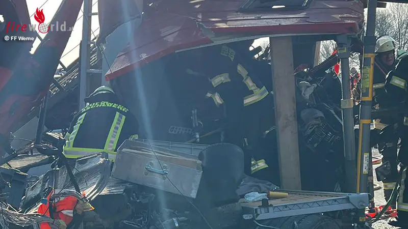 WERNE (DEUTSCHLAND): Am Dienstagmittag, 20. Jänner 2026, wurde die Leitung der Feuerwehr Werne sowie der Löschzug Mitte mit dem Alarmstichwort „TH2. Person – Verkehrsunfall zwei Lkw | ein Lkw brennt | eine Person klemmt“ um 11:08 Uhr auf die Bundesautobahn 1 in Fahrtrichtung Bremen alarmiert. Aufgrund der unklaren Örtlichkeit wurde die Feuerwehr Ascheberg ebenfalls zu diesem Einsatz alarmiert.