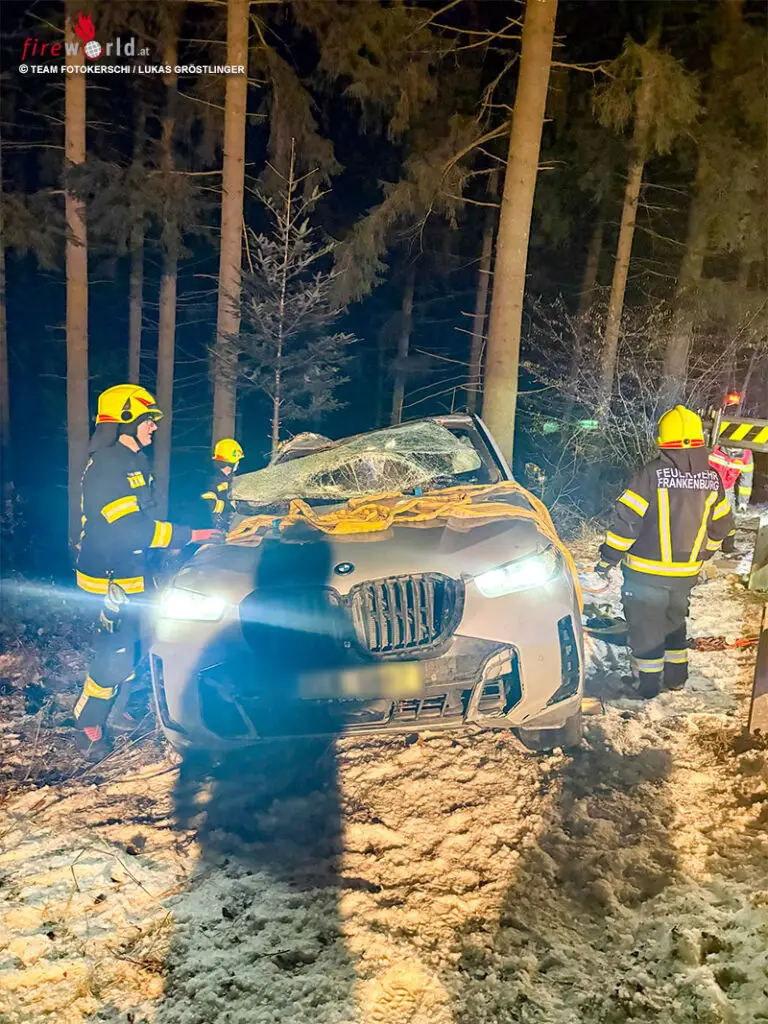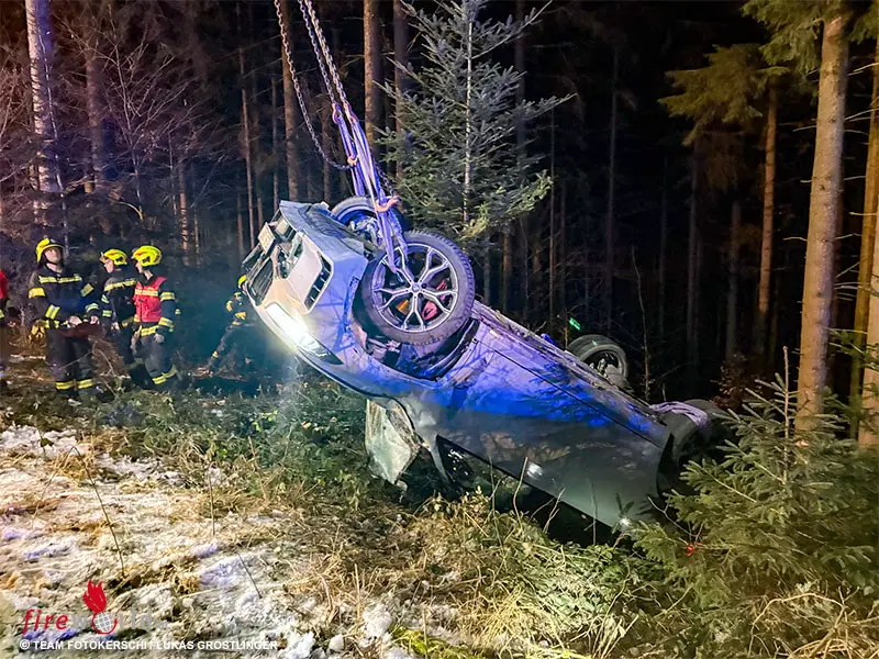 Gegen 20:49 Uhr wurden die Freiwilligen Feuerwehren Ampflwang im Hausruckwald und Eberschwang alarmiert. Ein Pkw war von der Fahrbahn abgekommen, hatte sich überschlagen und kam schließlich auf dem Dach im angrenzenden Waldstück zum Liegen.