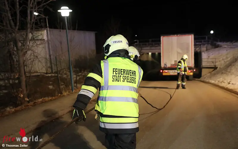 Stmk: Feuerwehr fädelt gerade noch vor Unterführung angehaltenen Sattelschlepper wieder aus