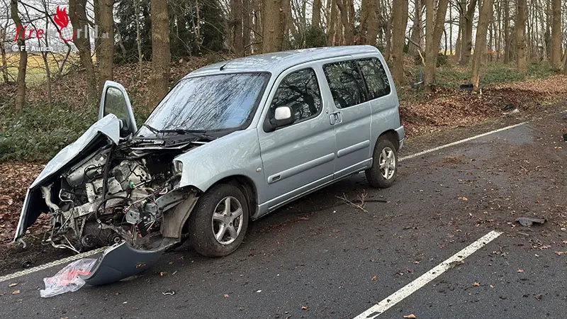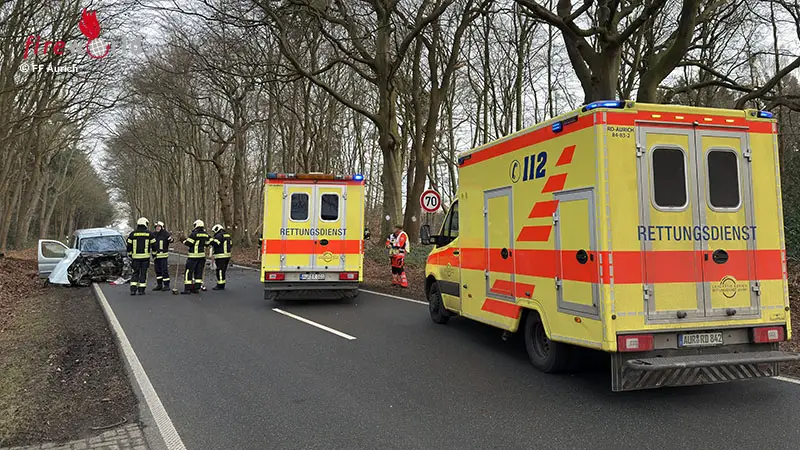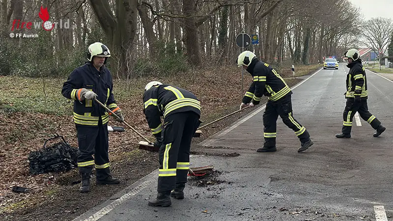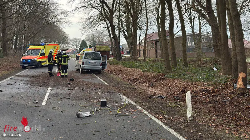 AURICH (DEUTSCHLAND): Kurz nach der Einmündung zur Ringstraße in Aurich ist in den Mittwochmittagsstunden, 21. Jänner 2026, ein Auto von der Fahrbahn der Brockzeteler Straße abgekommen und mit einem Baum kollidiert. Während das Fahrzeug zurück auf die Straße schleuderte, wurde der Motorblock durch den heftigen Aufprall aus dem Wagen gerissen.