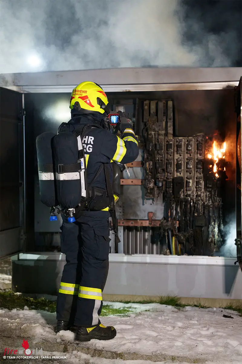 Bei Eintreffen der Einsatzkräfte stand eine Trafostation im Freien in Flammen. Die Feuerwehr begann umgehend mit einem Löschangriff unter schwerem Atemschutz, da dichte Rauchentwicklung und offene Flammen im Inneren der Anlage festgestellt wurden.