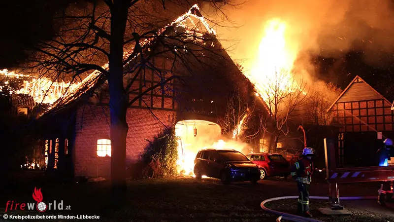ESPELKAMP (DEUTSCHLAND): Ein ehemaliges landwirtschaftliches Anwesen in der Tonnenheider Straße in Espelkamp wurde am frühen Freitagmorgen, 23. Jänner 2026, gegen 6 Uhr ein Raub der Flammen. Menschen kamen glücklicherweise nicht zu Schaden.