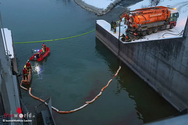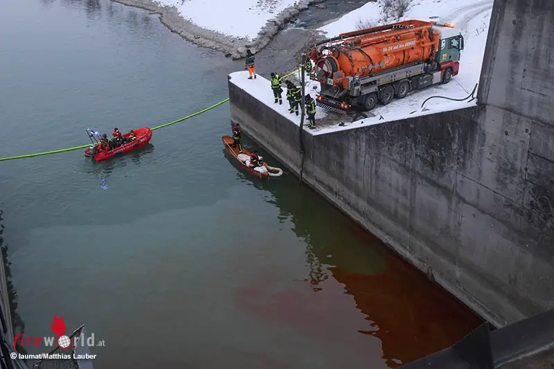 LAMBACH (OÖ): Einen langwierigen Einsatz bei frostigen Temperaturen hatten die Einsatzkräfte der Feuerwehr am Samstagnachmittag, 24. Jänner 2026, in Lambach (Bezirk Wels-Land) zu bewältigen. Ein größerer Ölaustritt in der Traun war der Grund.