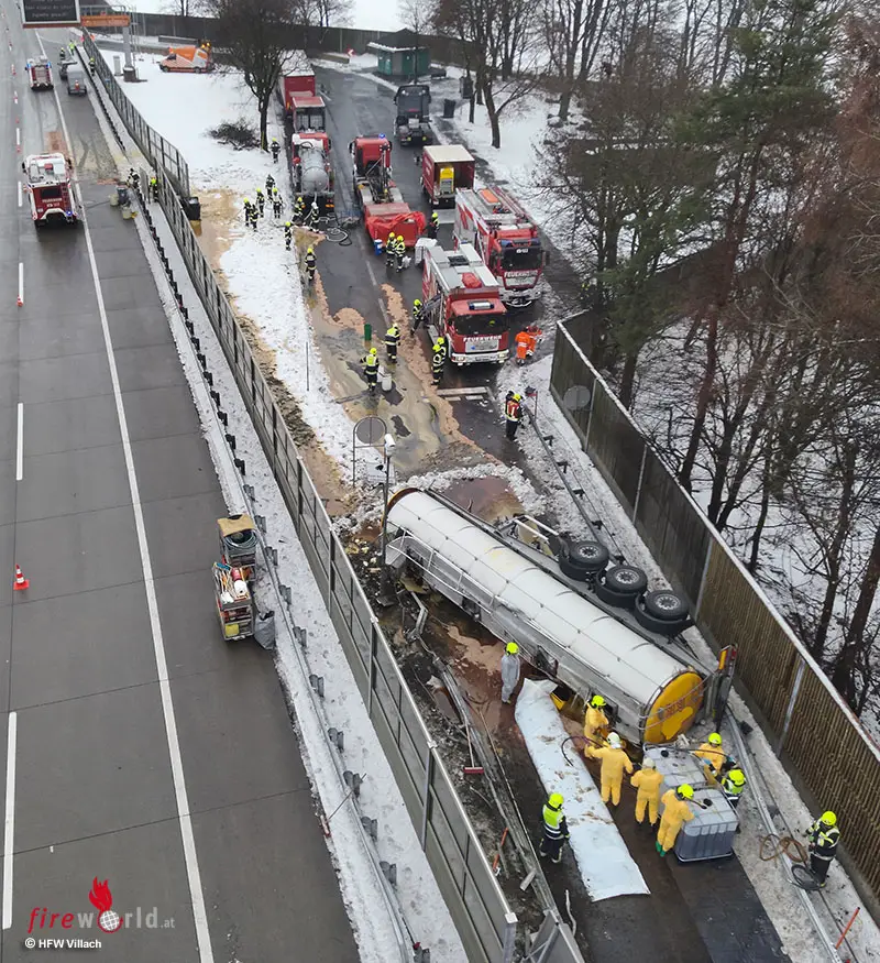 Durch die Wucht des Aufpralls wurde der Sattelauflieger von der Zugmaschine abgerissen und kippte um. Mehrere Notrufteilnehmer sowie die Autobahnpolizei meldeten über Notruf der Feuerwehr einen schweren LKW – Unfalles wo flüssiges Ladegut austreten solle. Infolgedessen alarmierte die Landesalarm- und Warnzentrale Kärnten (LAWZ) die Hauptfeuerwache Villach sowie die Freiwilligen Feuerwehren Velden und Wernberg.