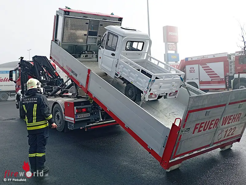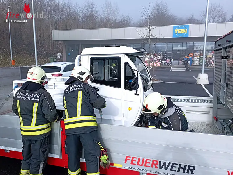 PINKAFELD (BGLD): Zu einem nicht alltäglichen Einsatz wurde die Freiw. Feuerwehr der Stadt Pinkafeld am Vormittag des 27. Jänner 2026 auf einen Parkplatz in der Grazerstraße alarmiert. Die Alarmmeldung lautete: Verkehrsunfall- Fahrzeugbergung + Polizei + Rotes Kreuz.