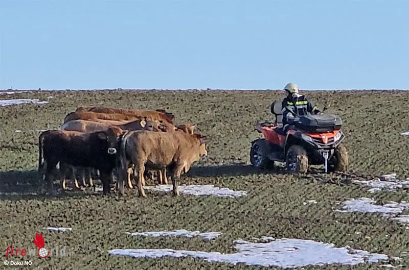 Beim Eintreffen der Feuerwehr hatten sich die Tiere bereits selbstständig aus dem Teich befreit. In weiterer Folge liefen jedoch rund 30 bis 40 Rinder unkontrolliert und weit verstreut über die umliegenden Felder.