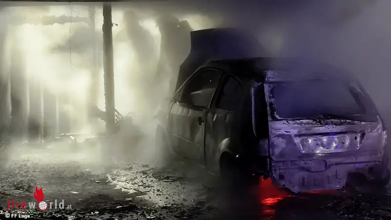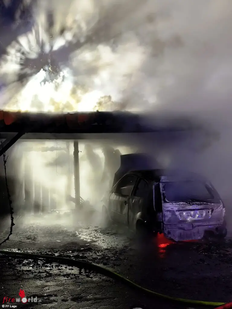 LAGE (DEUTSCHLAND): Die Feuerwehr Lage wurde am 29. Jänner 2026 um 23:29 Uhr zu einem Carportbrand in die Käthe-Kollwitz-Straße alarmiert. Beim Eintreffen der ersten Einsatzkräfte stand ein unter einem Carport abgestellter Pkw (Ford Fiesta) bereits in Vollbrand. Auch das Carport hatte zu diesem Zeitpunkt schon Feuer gefangen.