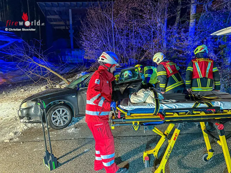 Oö: Pkw prallt in Sankt Lorenz in Kurve gegen Baum → Beifahrer schonend gerettet