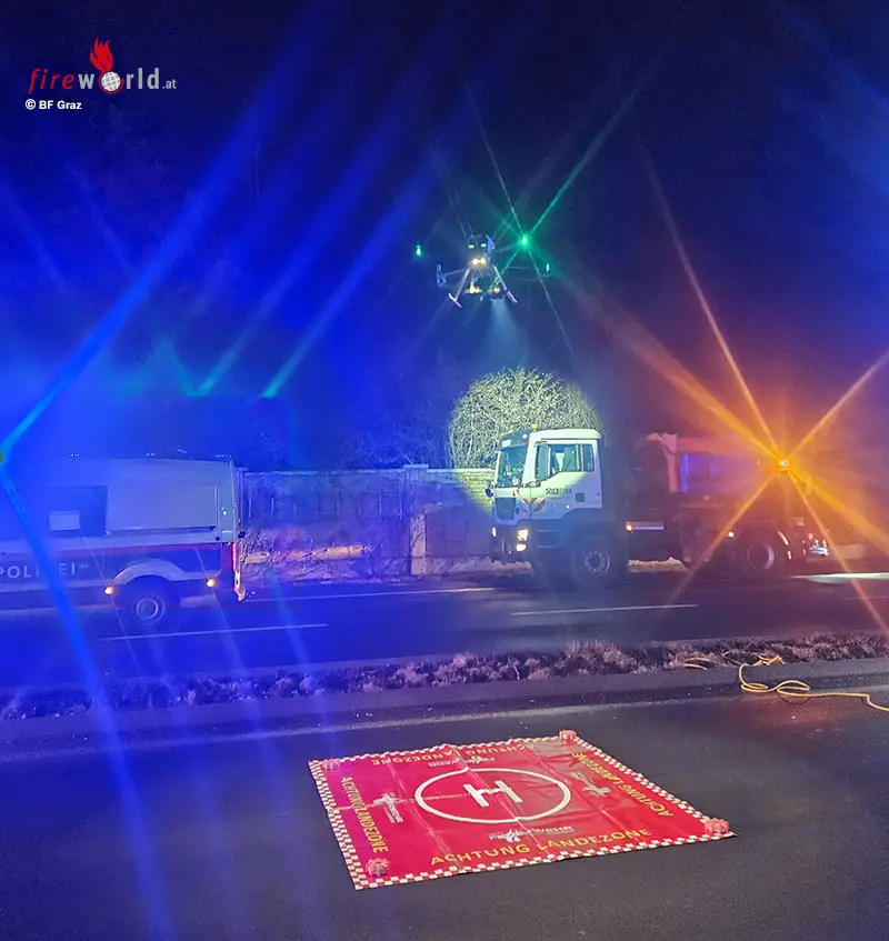 Auf Anforderung der Polizei wurde auch die Drohne der Feuerwehr zur Einsatzstelle beordert. Die Luftaufnahmen werden das Unfallkommando bei der Ermittlung des Unfallherganges unterstützen. Die Berufsfeuerwehr Graz stand mit insgesamt 6 Fahrzeugen und 21 Mann ca. 3 ½ Stunden im Einsatz.