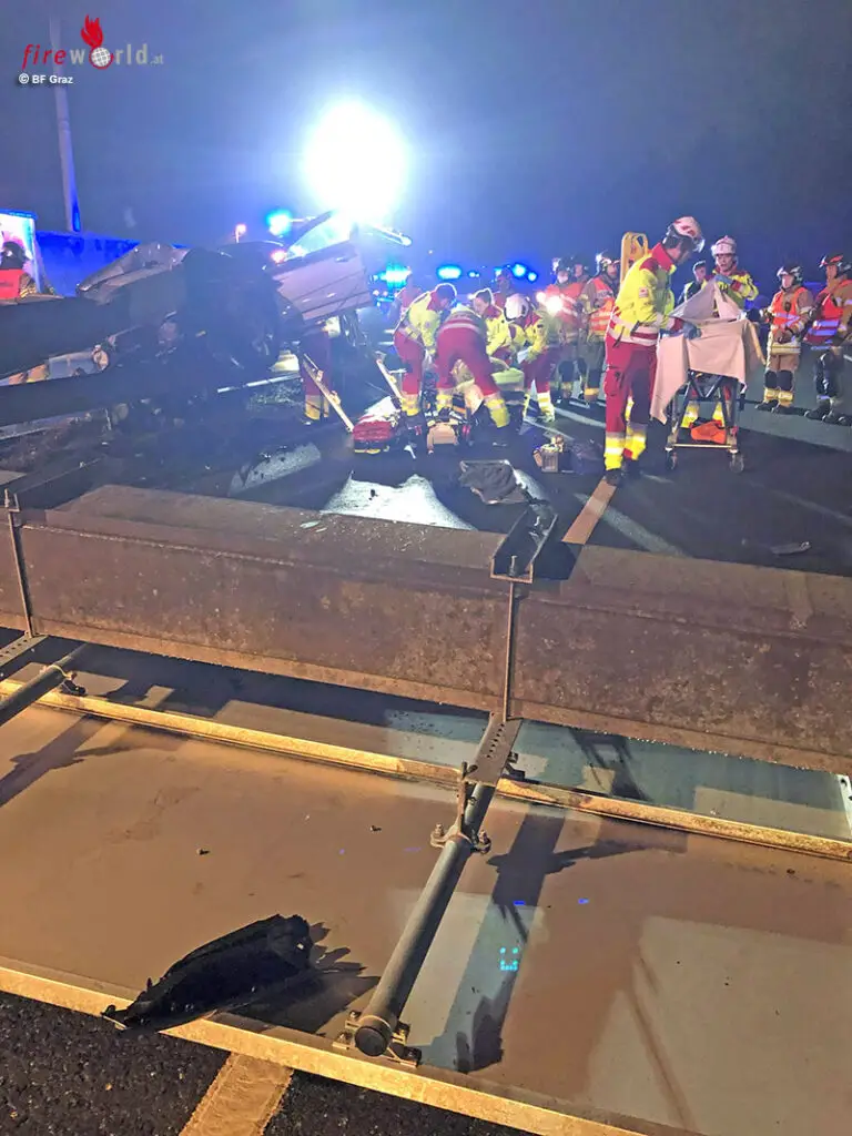 GRAZ (STMK): Zu einem folgenschweren Verkehrsunfall wurde die Berufsfeuerwehr Graz am 30. Jänner 2026 kurz nach 21.30 Uhr alarmiert. Auf der Liebenauer Tangente ist stadtauswärts kurz vor dem Murpark ein Pkw aus unbekannter Ursache von der Fahrbahn abgekommen, auf die Leitschiene aufgefahren und mit voller Wucht gegen einen Überkopfwegweiser geprallt.