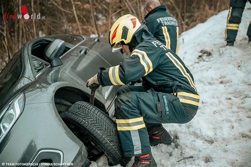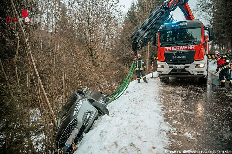Oö: Pkw-Bergung nach Unfall auf spiegelglatter Fahrbahn