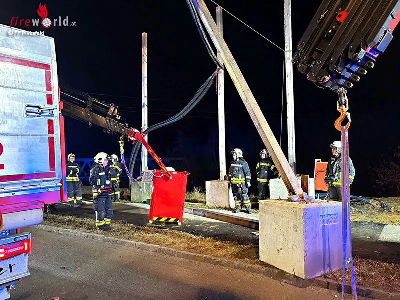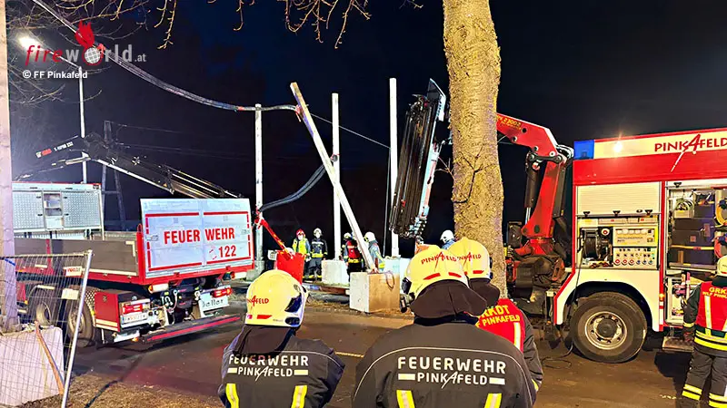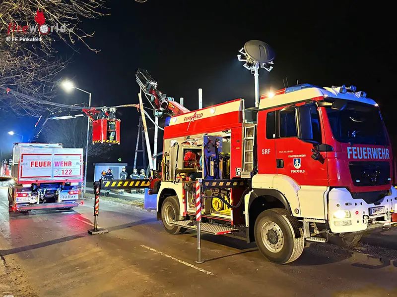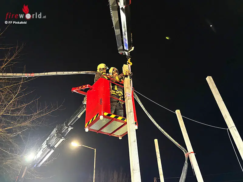 PINKAFELD (BGLD): In den Abendstunden des 3. Februar 2026 wurde die Freiw. Feuerwehr Pinkafeld mittels Rufempfänger zu einer T1- Stromleitung droht abzustürzen in die Steinamangerstraße alarmiert. Die FF Pinkafeld rückte mit einem ELF (Einsatzleitfahrzeug), einem SRF (schweres Rüstfahrzeug), einem RLF (Rüstlöschfahrzeug), einem WLF (wechselladerfahrzeug) und 25 Mann zum Einsatz aus.