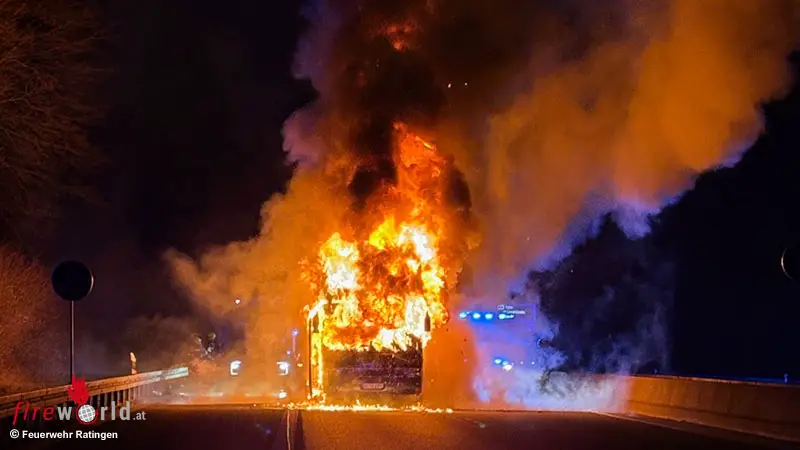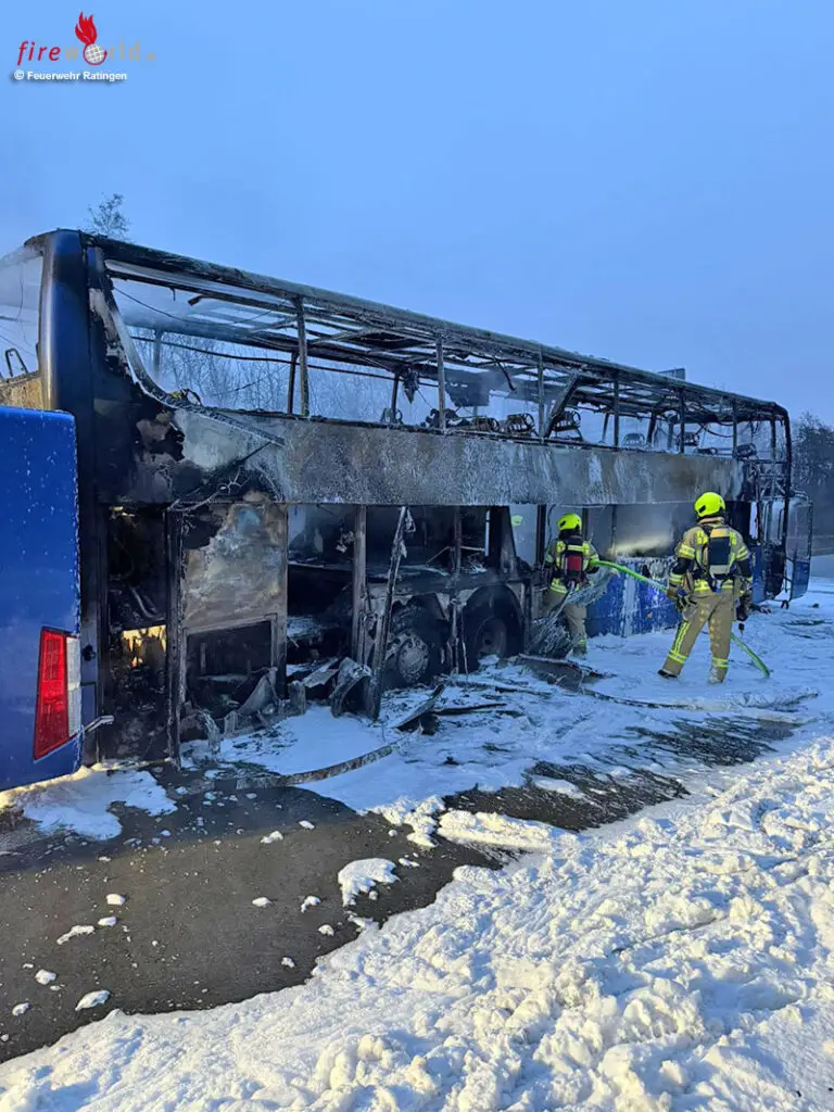 RATINGEN (DEUTSCHLAND): Am frühen Morgen des 6. Februar 2026 wurde die Feuerwehr Ratingen zu einem Brandereignis auf die Bundesautobahn 52 alarmiert. Gegen 06:55 Uhr meldeten mehrere Anrufer einen brennenden Reisebus auf der BAB 52 in Fahrtrichtung Essen, kurz vor der Ruhrtalbrücke.