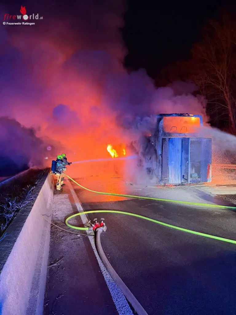 Unverzüglich wurde ein Löschangriff mit drei Strahlrohren eingeleitet. Aufgrund der Lage und zur Gewährleistung der Sicherheit aller Beteiligten musste die Autobahn in beide Fahrtrichtungen voll gesperrt werden. Eine besondere Herausforderung stellten die schwierigen Löschwasserbedingungen dar, weshalb verstärkt Tanklöschfahrzeuge eingesetzt wurden.