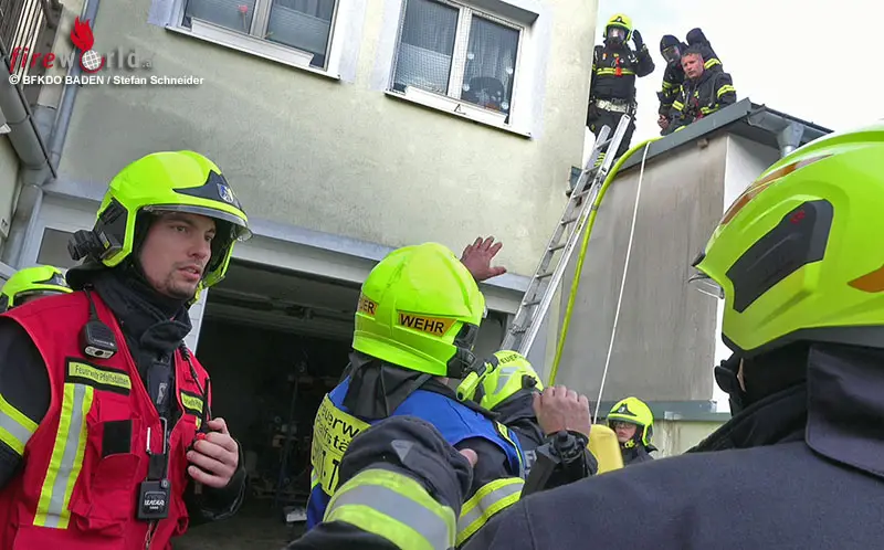 Daraufhin wurde die örtliche Freiwillige Feuerwehr Pfaffstätten kurz vor 15 Uhr zu einem Brandeinsatz B1 Rauchentwicklung beim Dach alarmiert. Um für die nähere Erkundung auf das betroffene Dach des zweistöckigen Wohnhauses aufsteigen zu können, mussten die Feuerwehrleute über das Flachdach des Nachbargebäude vorgehen, wo sie eine weitere Steckleiter aufstellen konnten.