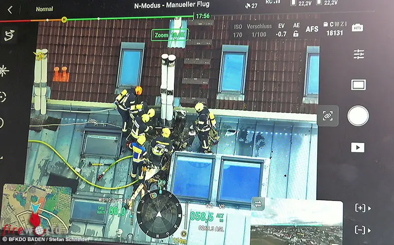In Folge öffneten die Feuerwehrleute mittels Brech- und Trennwerkzeugen die Dachhaut. Ein weiterer Atemschutztrupp erkundete im Gebäudeinneren, wo ebenfalls eine erhöhte Temperatur im betroffenen Dachbereich gemessen wurde. Mit einer Drohne der Polizei, samt zusätzlicher Wärmebildfunktion, war es der Einsatzleitung möglich laufend das Geschehen via Bildschirm vom Boden aus mitzuverfolgen.
