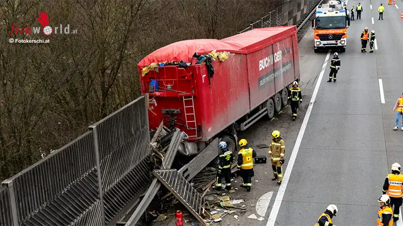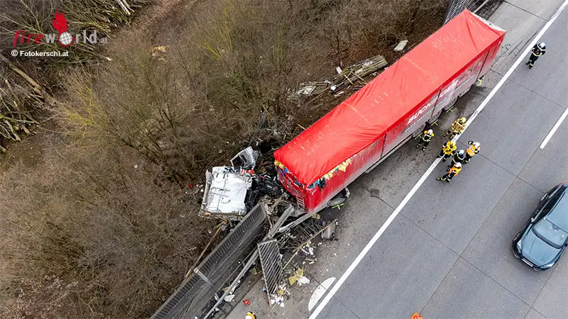 Ein Sattelzug krachte dort aus noch unbekannten Gründen gegen die Lärmschutzwand. Die Fahrerkabine riss fast vollständig vom Fahrgestell ab und kam schwerst beschädigt in der Böschung zum Liegen. Der Lkw-Lenker konnte das Wrack offenbar selbstständig verlassen. Er wurde schwer verletzt. Ersthelfer und Anwohner versorgten den Verletzten unterhalb der Einsatzstelle, von wo auch Rettung und Notarzt zufuhren und den Verletzten in weiterer Folge ins Krankenhaus brachten.