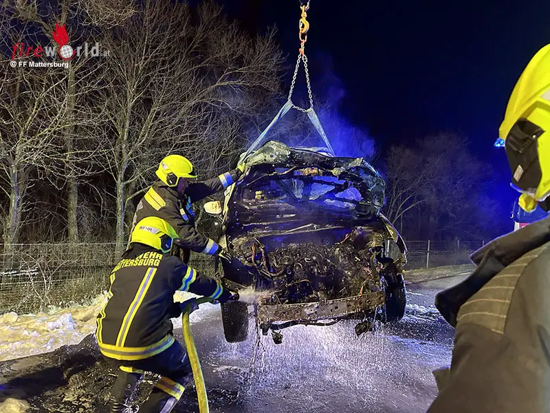 Nach Abschluss der Löscharbeiten wurde das Fahrzeug mithilfe des Kran auf das Wechselladerfahrzeug verladen und von der Schnellstraße verbracht. Die Feuerwehr Mattersburg stand mit fünf Fahrzeugen für etwa eineinhalb Stunden im Einsatz.