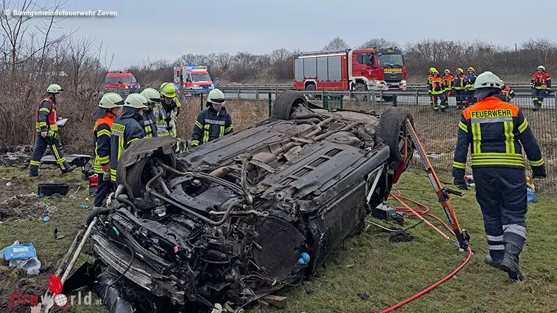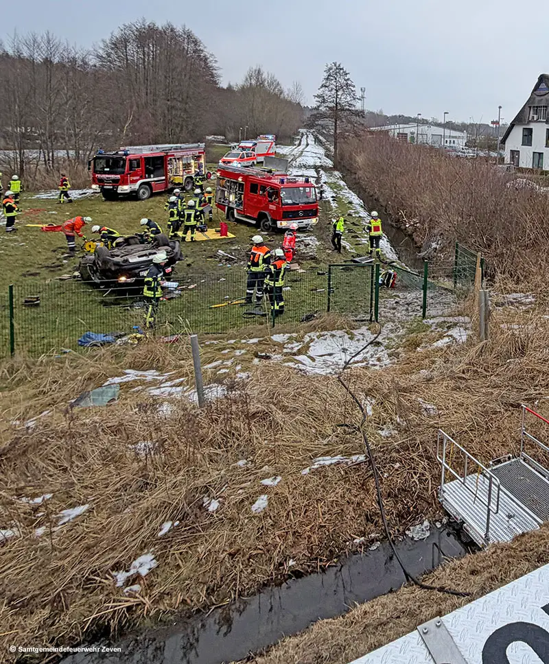 D: Fahrer bei durch die Luft geflogenen Pkw eingeklemmt → Personenrettung bei Bockel