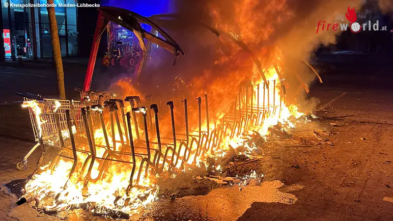 Als die Einsatzkräfte eintrafen, stand der Unterstand mit 49 dazugehörigen Einkaufswagen lichterloh in Flammen. Zuvor hatte eine Zeugin um kurz nach 22 Uhr Rauch bemerkt, der von dem westlichen Parkplatz des Porta Einrichtungshauses emporstieg. Daraufhin ging die Frau zusammen mit weiteren Personen zu der Parkfläche und bemerkte das Feuer.