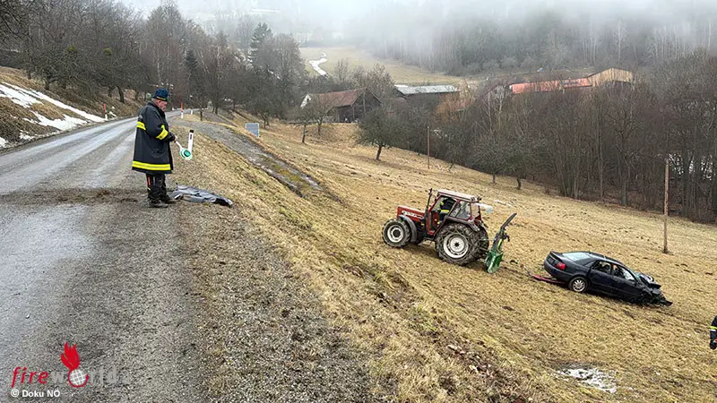 Für die Bergung des verunfallten Pkw wurde die Feuerwehr von einem Landwirt mit einem Traktor samt Seilwinde unterstützt.