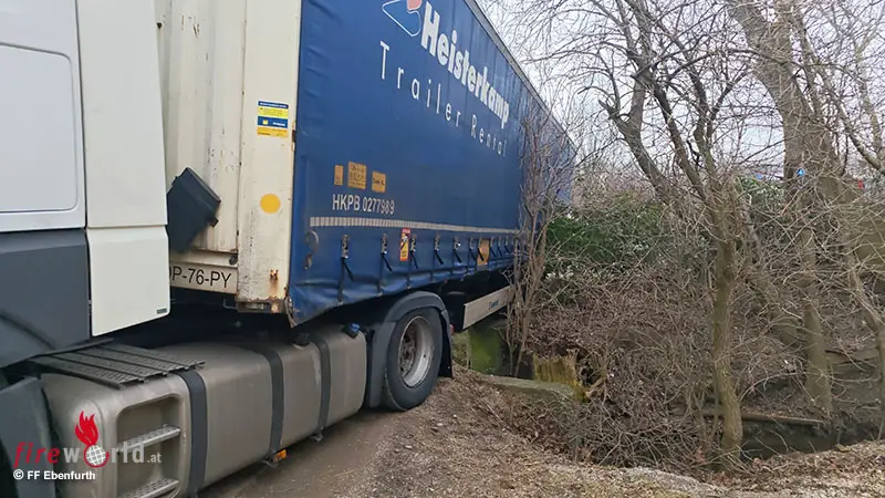 EBENFURTH (NÖ): Ein mit in Big Bags abgefülltem Streusalz beladener Sattelschlepper, der den Bauhof der Stadtgemeinde Ebenfurth beliefern sollte, bog knapp 100 m vor seinem Ziel falsch ab. Endstation war für den Sattelzug nach knapp 500m – er fuhr sich an einer nur für Pkw ausgelegten Brücke fest.