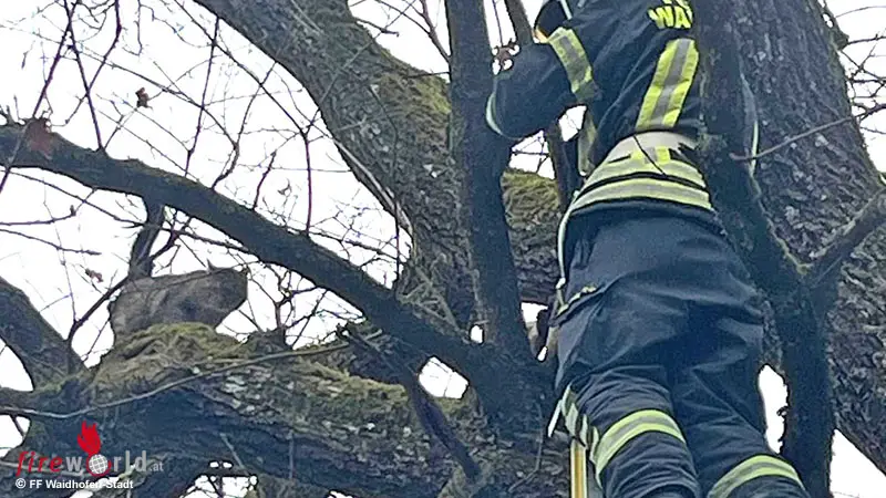 Zwei Tage saß sie weit oben im kahlen Baum, miaute herzzerreißend und sorgte für große Aufregung. Daher wurde die Freiwillige Feuerwehr Waidhofen/Ybbs-Stadt am 12. Februar 2026 alarmiert. Mit Leiter und Teamgeist rückten die Kameraden Gregor, Wolfgang, Michael, Luki und Alex an. Während unten alles gesichert wurde, machte sich Feuerwehrmann Luki bereit für eine besondere Mission. Und nein, diesmal war es kein Atemschutzgerät für Luki, sondern schweres „Rettungsgerät“ der besonderen Art: Katzenspielzeug und Leckerlis.