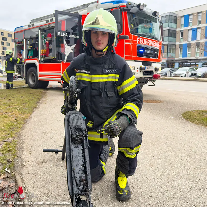 Ein Atemschutztrupp setzte einen CO₂-Löscher zur Brandbekämpfung ein und konnte das Feuer am E-Scooter rasch ablöschen. Parallel wurde vorsorglich eine Löschleitung aufgebaut, die jedoch nicht mehr benötigt wurde. Zur weiteren Sicherung legte die Feuerwehr den beschädigten E-Scooter in einen mit Wasser gefüllten Müllbehälter, um ein mögliches Wiederaufflammen durch den Lithium-Ionen-Akku zu verhindern. Der Einsatz war nach kurzer Zeit beendet.
