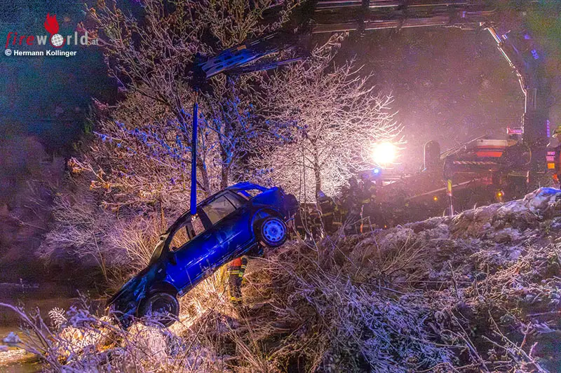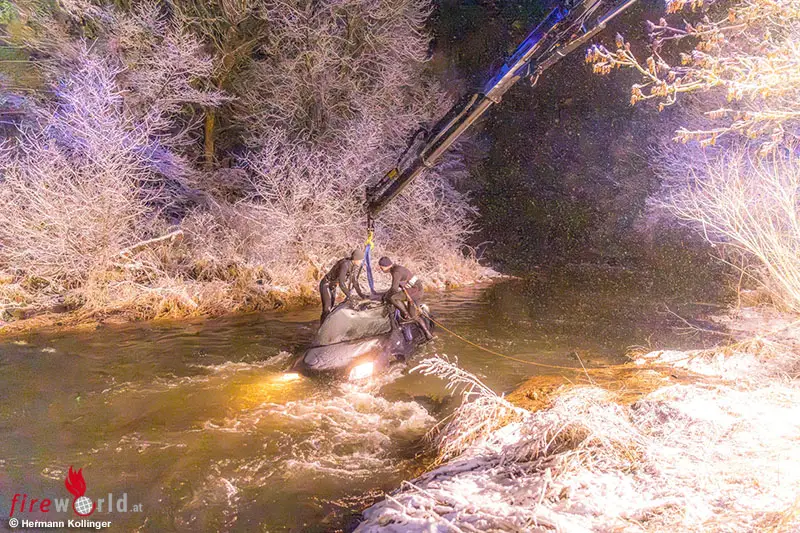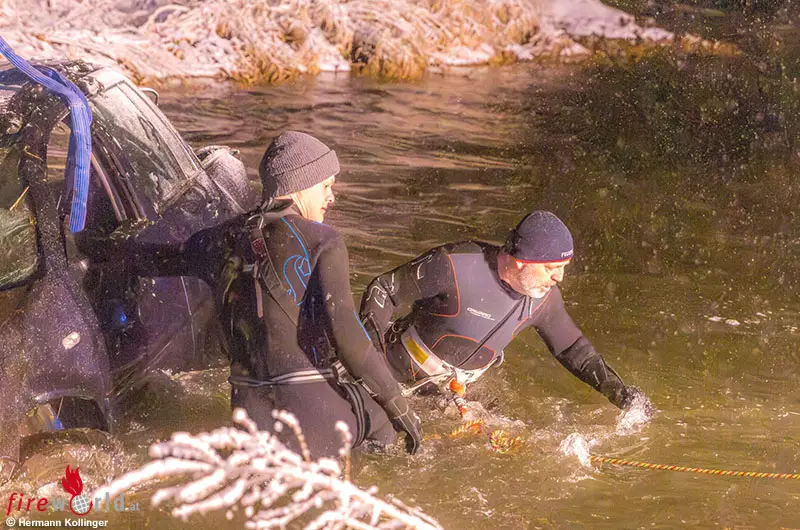 Infos zufolge wurde der junge offensichtlich unverletzt gebliebene Mann von einem Anwohner aus dem Pkw geholt. In weiterer Folge wurde über die Landeswarnzentrale in Linz die Feuerwehr Alkoven mit dem Kranfahrzeug angefordert. Aufgrund der Strömung im Gewässer erfolgte ebenso die Anforderung von Tauchern mit Neoprenanzug für das Anschlagen des Pkw.