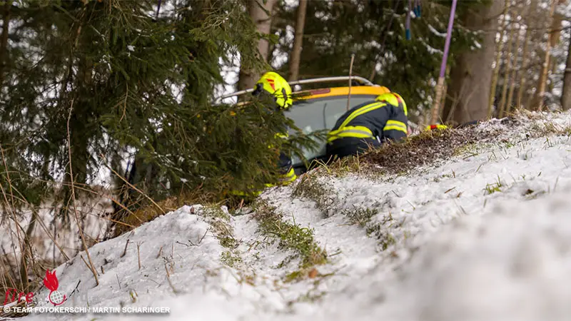 Ein Fahrzeuglenker verlor die Kontrolle über sein Fahrzeug und kam von der Fahrbahn ab. In weiterer Folge stürzte das Auto über eine Böschung in den angrenzenden Wald und prallte dort gegen einen Baum.