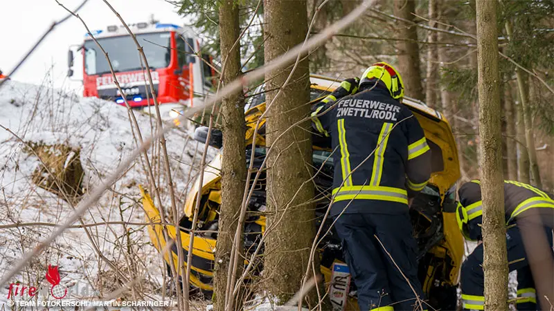 Ein Fahrzeuglenker verlor die Kontrolle über sein Fahrzeug und kam von der Fahrbahn ab. In weiterer Folge stürzte das Auto über eine Böschung in den angrenzenden Wald und prallte dort gegen einen Baum.