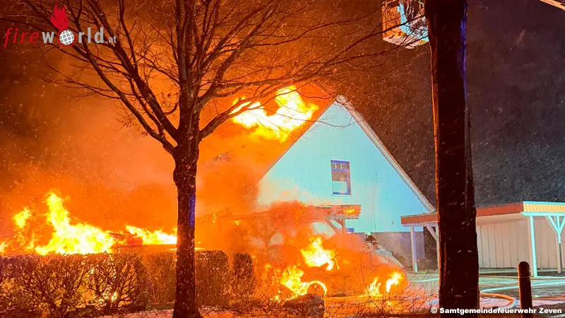 ZEVEN (D): Zu einem ausgedehnten Brand der Alarmstufe F2-Y (später F3) wurden am 16. Februar 2026 um 1.58 Uhr mehrere Feuerwehren nach Zeven alarmiert. Beim Eintreffen der ersten Einsatzkräfte stand ein Carport bereits in Vollbrand. Die Flammen hatten zu diesem Zeitpunkt auf das angrenzende Wohnhaus übergegriffen.