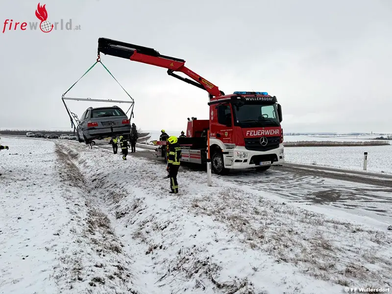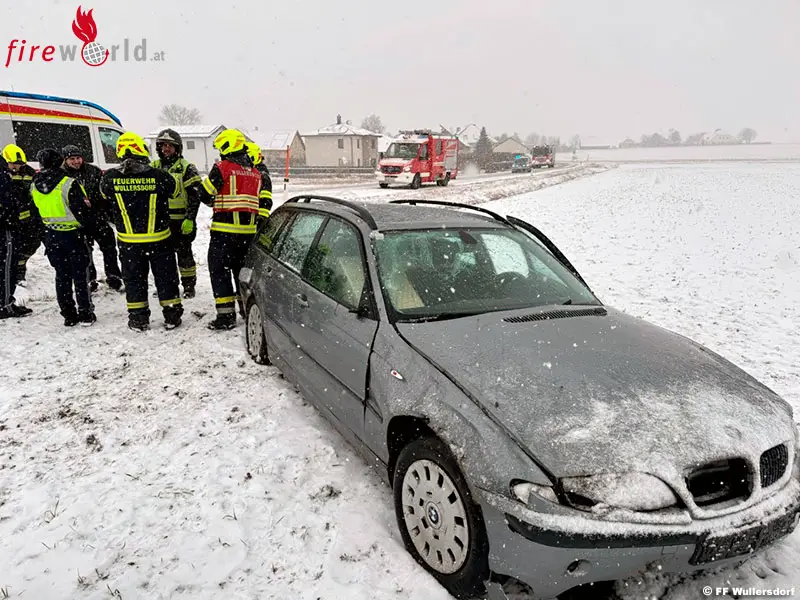 WULLERSDORF (NÖ): Am 16. Februar 2026, in den Mittagsstunden, wurden die Freiwilligen Feuerwehren Aspersdorf, Hollabrunn und Wullersdorf während des Schneetreibens zu einem Verkehrsunfall mit Menschenrettung alarmiert. Unverzüglich setzten sich drei Fahrzeuge der FF Wullersdorf in Richtung Einsatzort in Bewegung.