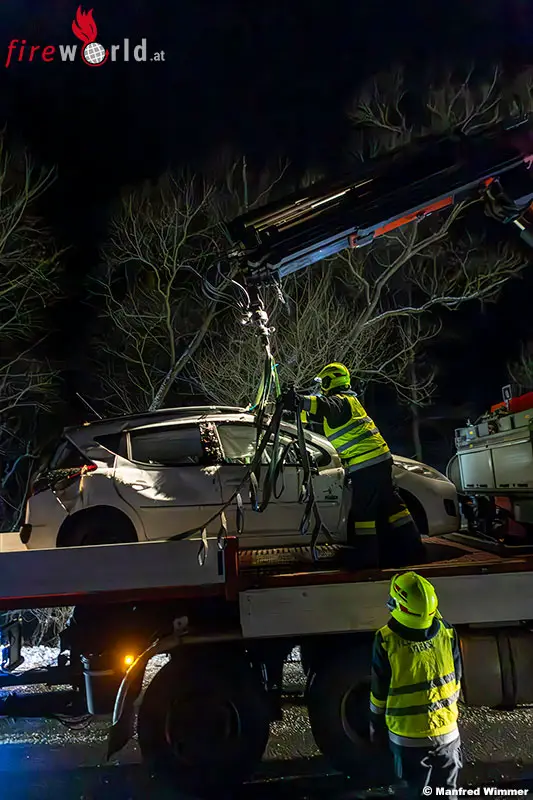 Nach dem Eintreffen der Kameraden aus Krems wurde der Kran in Stellung gebracht, das Wrack fachgerecht angeschlagen und sicher zurück auf die Fahrbahn gehoben. Dort stellten die Einsatzkräfte das Auto mit vereinter Muskelkraft wieder auf die Räder, bevor es mittels Kran auf das Bergeplateau verladen und nach Meisling zu einem geeigneten Abstellplatz abtransportiert wurde.