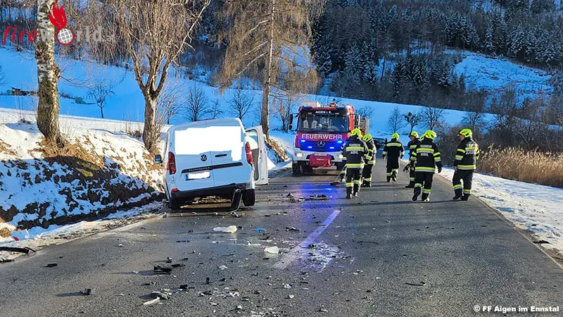 AIGEN IM ENNSTAL (STMK): Am Montagnachmittag, den 16. Februar 2026, wurde die Freiwillige Feuerwehr Aigen im Ennstal zu einem Verkehrsunfall auf der L741 im Bereich der Umfahrung Ortsteil Fischern alarmiert.